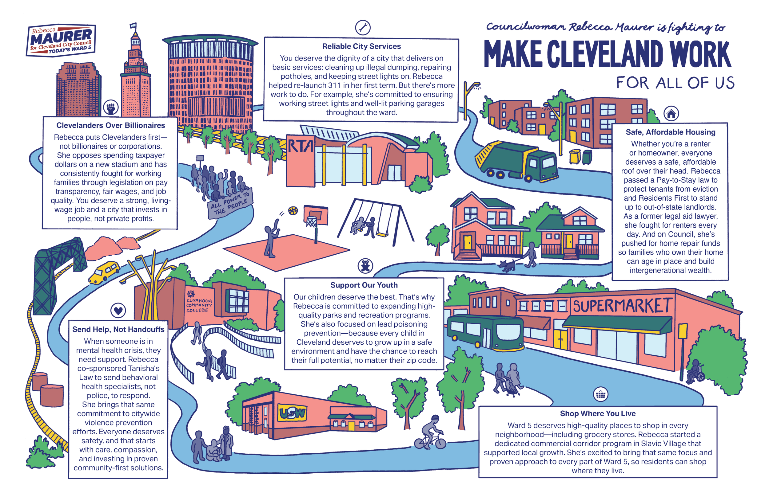 Created in collaboration with Cleveland City Council candidate (and dear friend) Rebecca Maurer, this illustration lays out Rebecca’s policy priorities for today’s Ward 5 and the city as a whole. I deeply admire Rebecca’s commitment to advocating for her constituents, her determination to speak truth to power, and her love for the city we both call home.